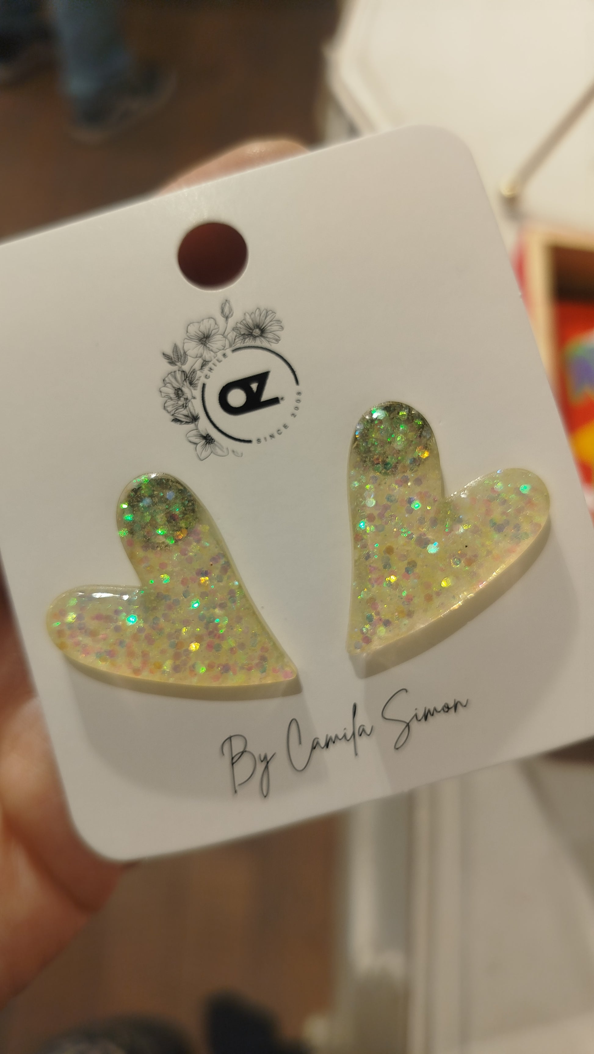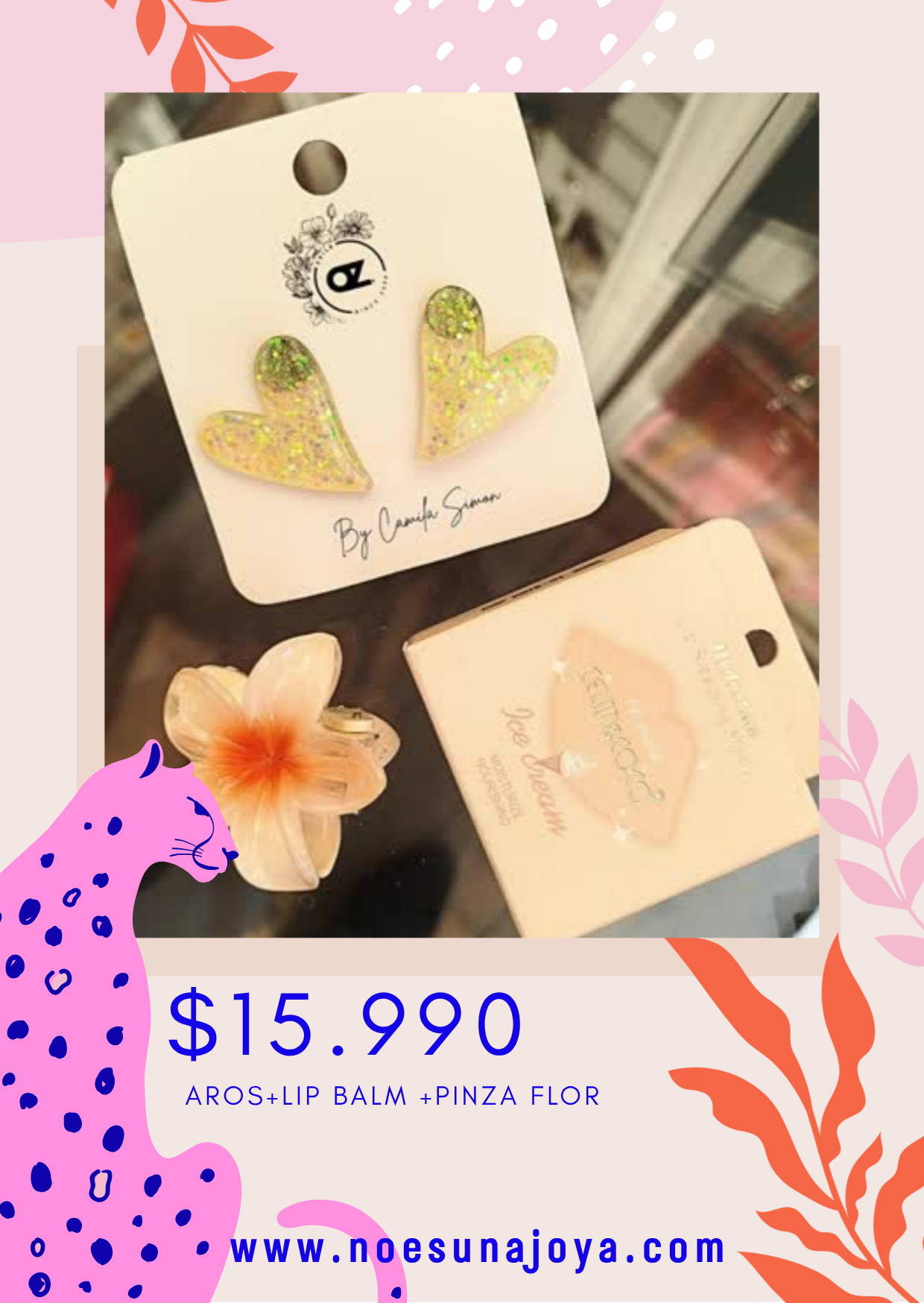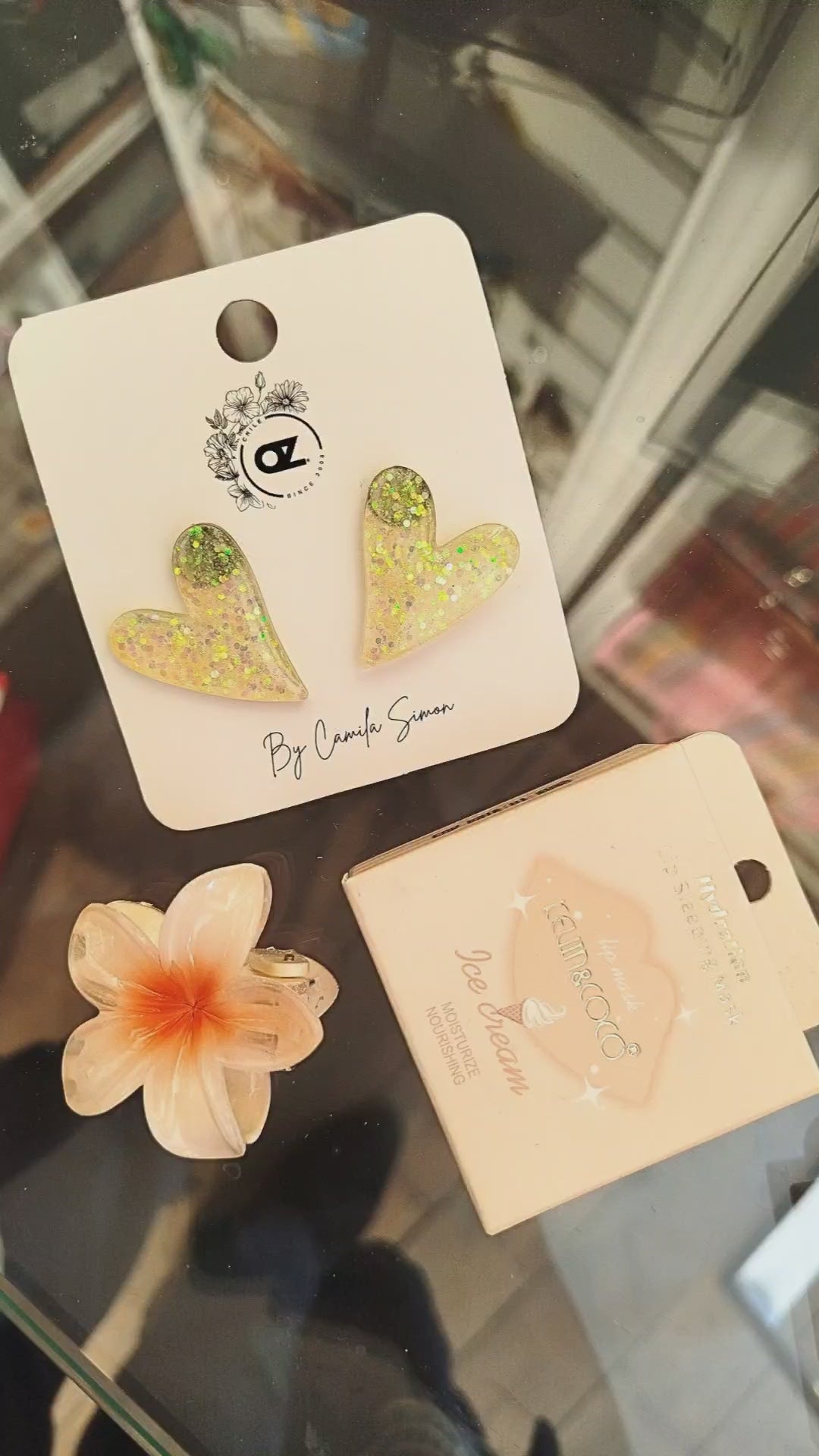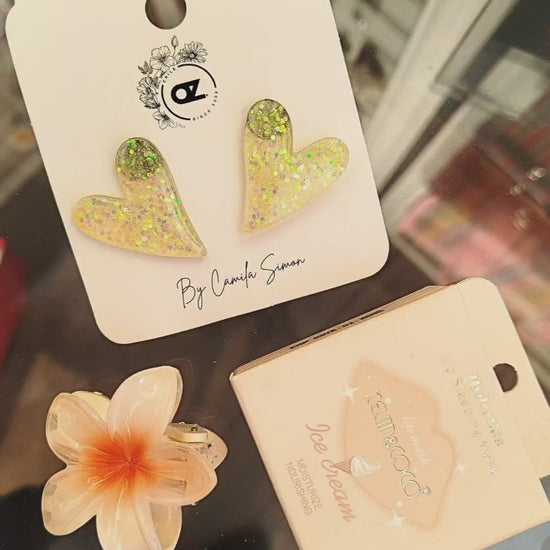 Aritos de corazón resina vainilla glitter tamaño 4 cm hipoalergénico + Mascarilla labial nocturna súper rica con aroma a durazno + pizza cabello Tamaño S en forma de florcita hawaiana ....imposible que no te quieran aún más 😂