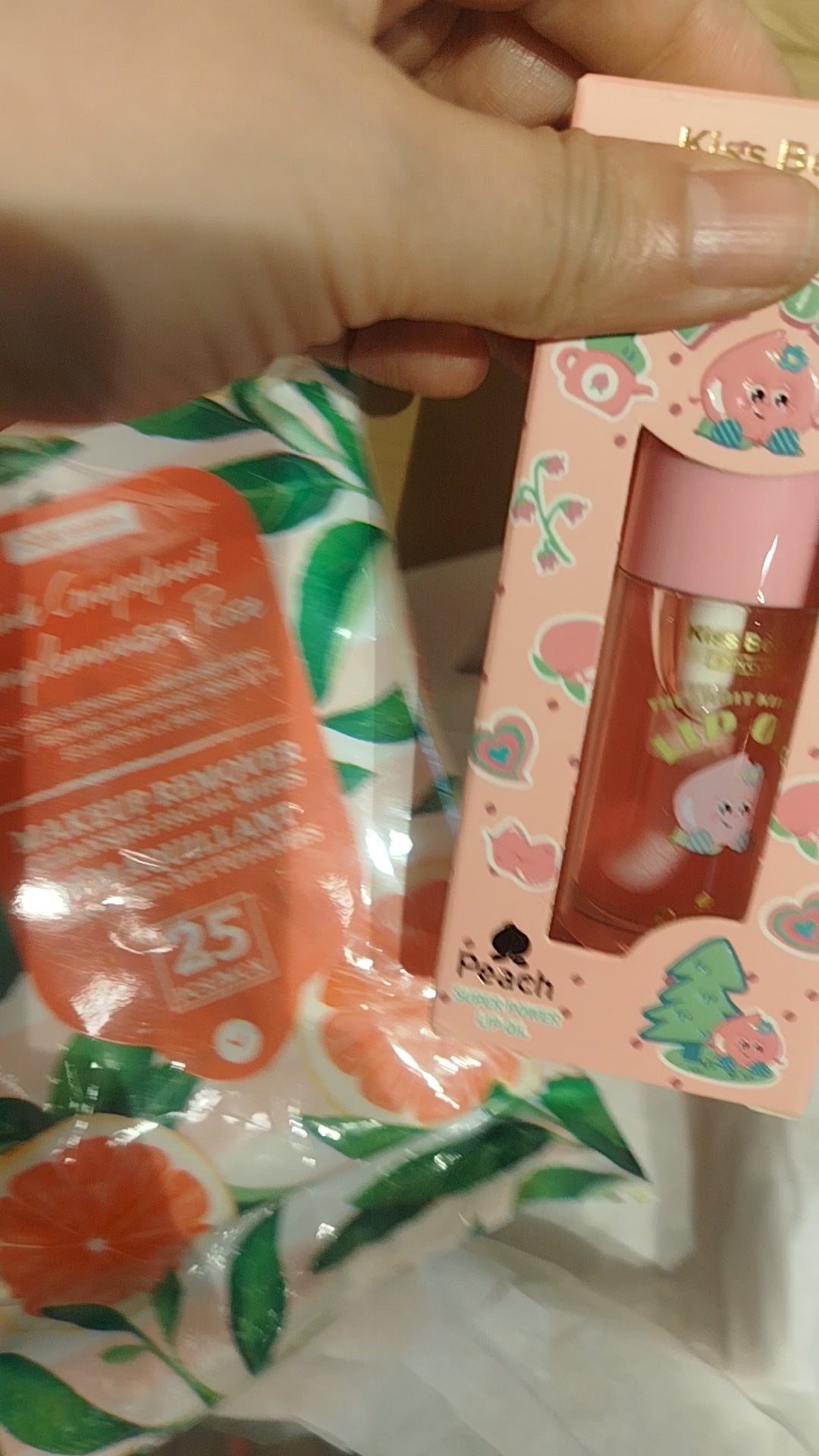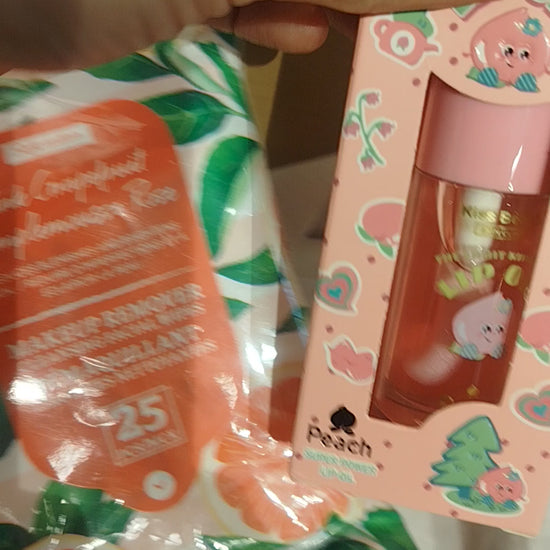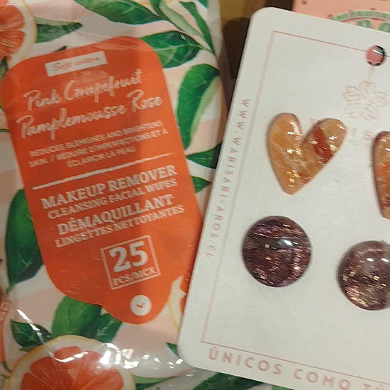 Está cajita está llena de felicidad. Trae un pack de aritos de resina hipoalergénicos hermosos (vienen dos pares ) + lip oil con aceites para tus labios olorcito a durazno+toallitas desmaquillantes super soft con vitaminas y aroma a pomelo.